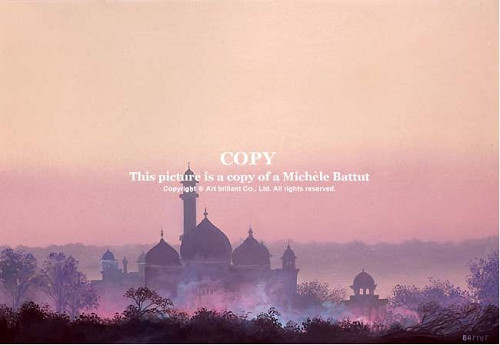 インドとは私にとってバラ色の国であり、雑踏と喧騒、ノイズ、褐色の肌の人々、宗教、様々な色に彩られたサリーに身をつつむ女性たちが混沌とした世界です。 日の出はとても美しく、ついこの間、ファティプル(インド北部)にある友人の画家の宮殿を訪れた時も、私を取り囲む全てを染めていく朝日の美しさに圧倒されました。 インドの建造物やモスク(イスラム教の寺院)の輪郭が、これから昇りはじめる太陽によって地平線にくっきりと浮かび上がってみえます。